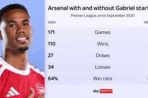 据天空体育统计,阿森纳在没有加布里埃尔的情况下,胜率下跌多达24%。